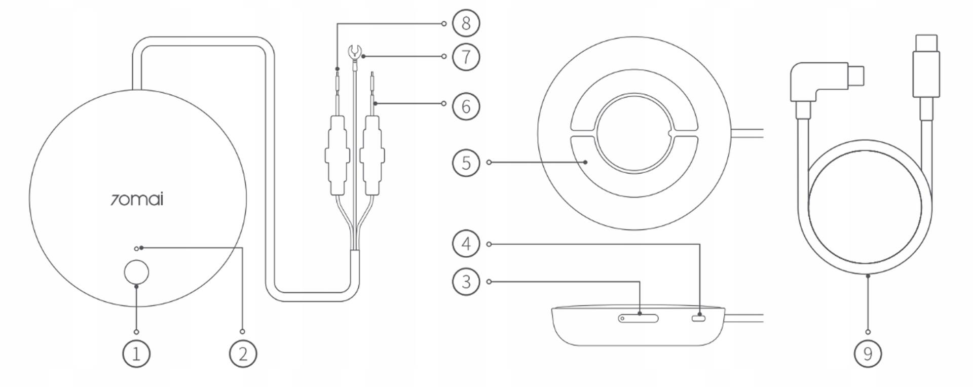 1. Przycisk reset2. Wskaźnik LED3. Slot na kartę SIM4. Port Typ-C5. Naklejka samoprzylepna6. Przewód zasilający (czerwony)7. Przewód uziemienia (Czarny)8. Przewód ACC (Żółty)9. Przewód USB-C