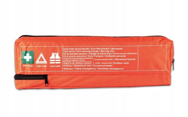 Apteczka samochodowa pierwszej pomocy zapakowana w praktyczny wodoodporny pokrowiec, z oddzielną kieszenią na kamizelkę odblaskową oraz trójkąt ostrzegawczy