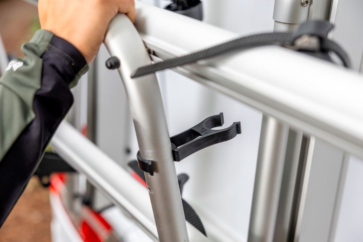 Uchwyty do mocowania kół są regulowane, rowery przypina się za pomocą zintegrowanych pasków