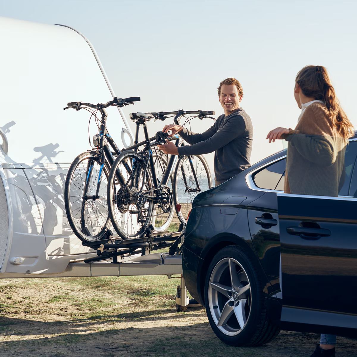 Łatwe mocowanie rowerów przy użyciu odłączanych ramion z zamykanymi gałkami Thule AcuTight, które kliknięciem sygnalizują, że osiągnięto optymalną siłę mocowania