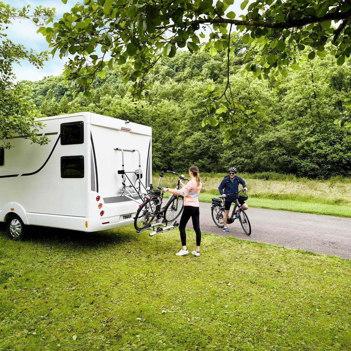 Łatwe mocowanie rowerów przy użyciu odłączanych ramion z zamykanymi gałkami Thule AcuTight, które kliknięciem sygnalizują, że osiągnięto optymalną siłę mocowania