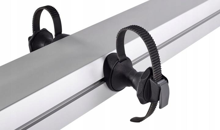 Zajmuje mało miejsca, gdy nie jest używany - stelaż można przesunąć (bez rowerów) na bok lub całkowicie zdemontować, pozostawiając na podłodze jedynie szyny montażowe