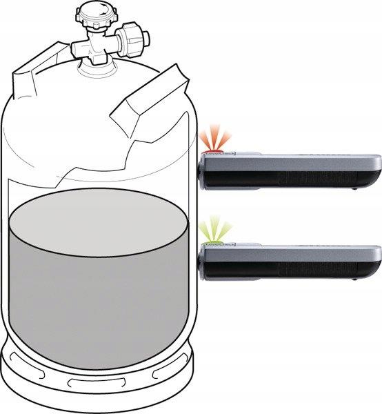 Prosta obsługa poprzez przyłożenie pod kątem 90 ° czujnika (dioda świeci na zielono jeśli w butli jest gaz, w przeciwnym razie świeci na czerwono)