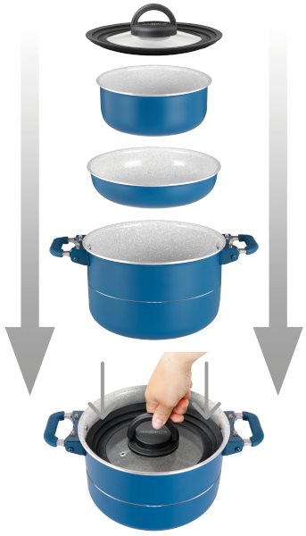 System łączenia garnków, który dzięki zastosowaniu składanych uchwytów ze zintegrowanymi elementami magnetycznymi, pozwala znacznie zmniejszyć wielkość opakowania zestawu garnków