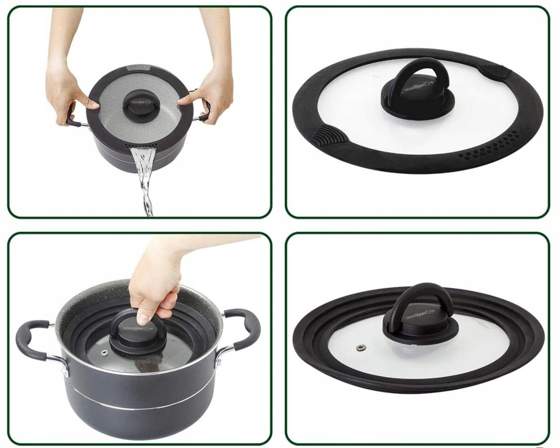 Szklane pokrywki z silikonowymi rantami i składanym uchwytem