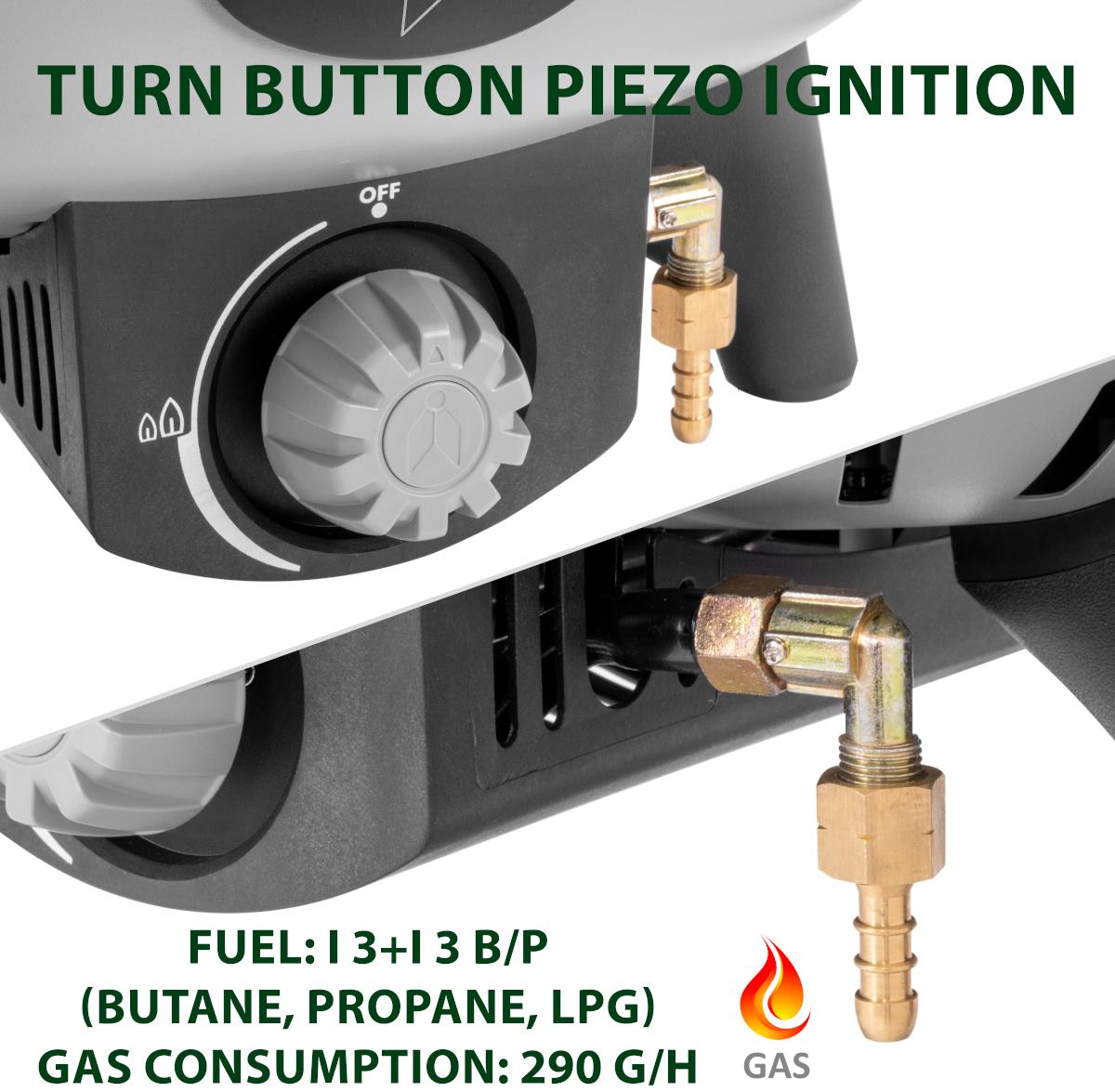 Zasilany propan butanem (LPG) - może być podłączany do butli gazowych lub zewnętrznych przyłączy gazowych z szybkozłączką