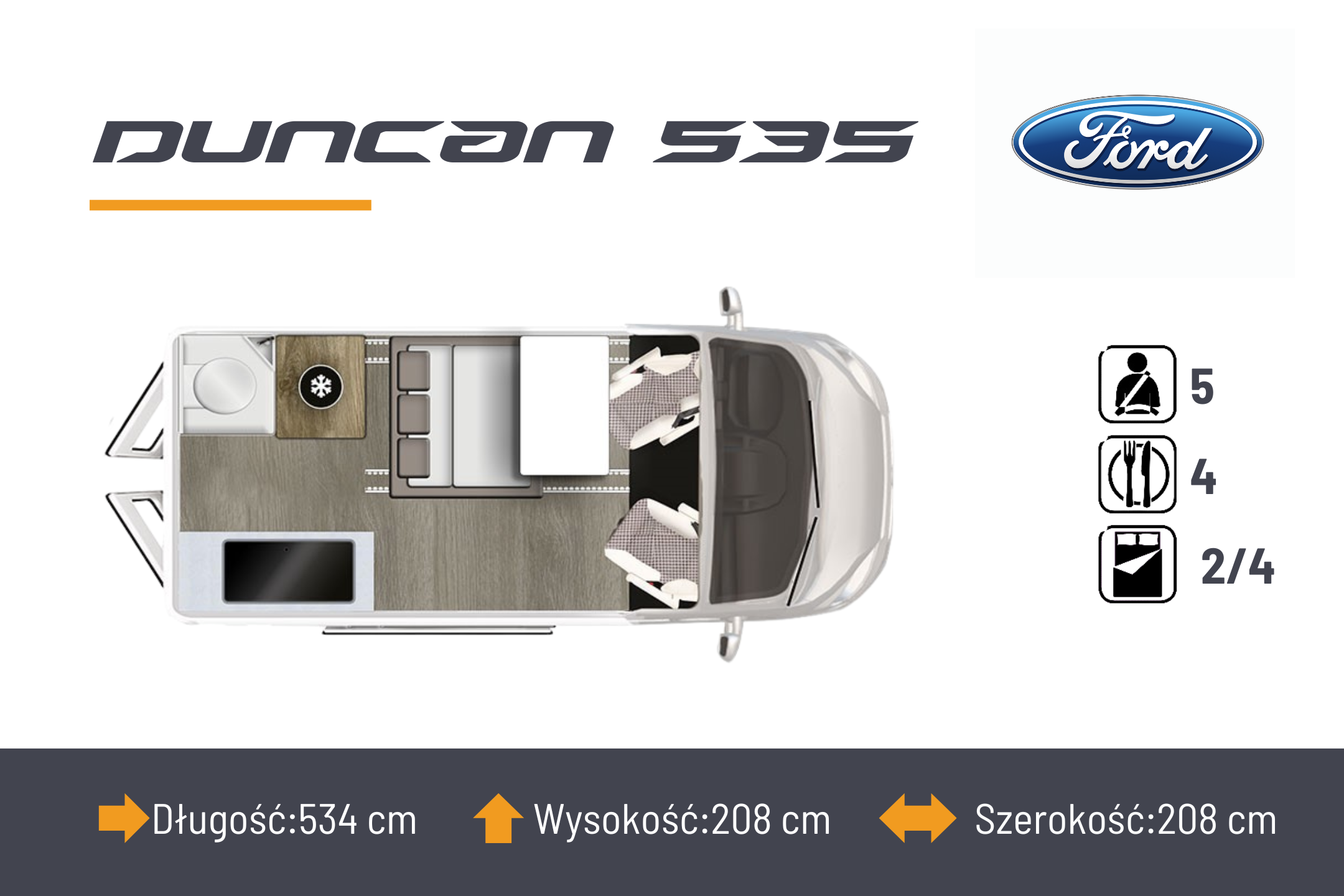 Karmann-Mobil Duncan 535 to kamper stworzony z myślą o wszechstronności. Samochód nadaje się zarówno do codziennego użytkowania jak i na dłuższy wyjazd, zawiera bowiem w sobie wszystkie udogodnienia i funkcje tradycyjnego kampera. Nieważne jak daleko się udasz, zawsze możesz czuć się jak u siebie w domu, korzystając zarazem ze wszystkich korzyści płynących z niewielkich rozmiarów tego kampera. Jeżeli cechuje Cię spontaniczność i żądza przygód, ale cenisz sobie również praktyczność i pragmatyzm to Duncan 535 jest samochodem idealnym dla Ciebie.