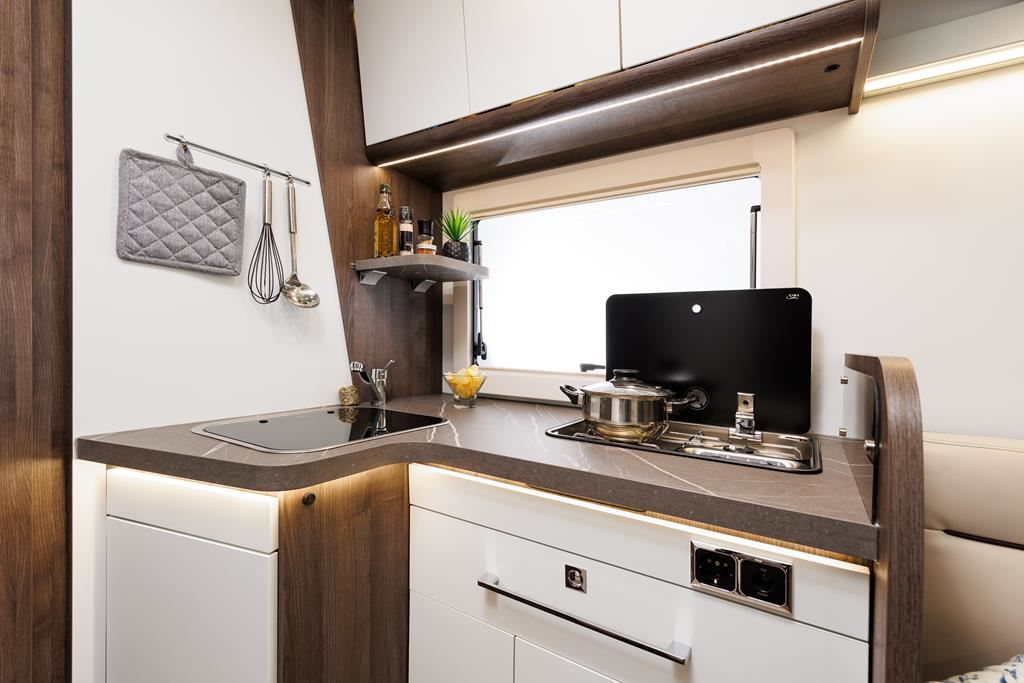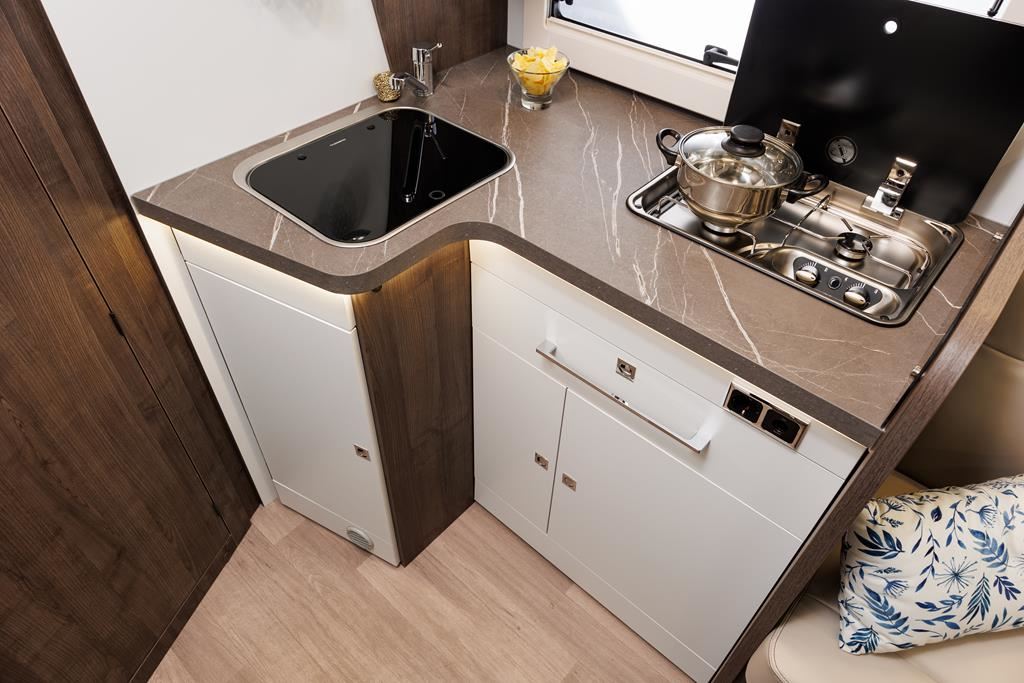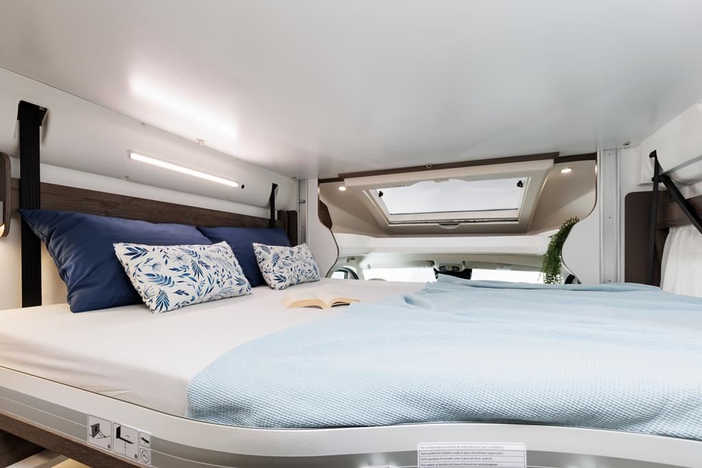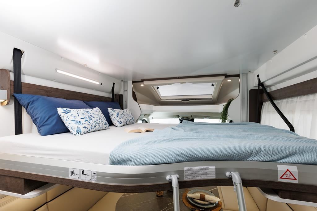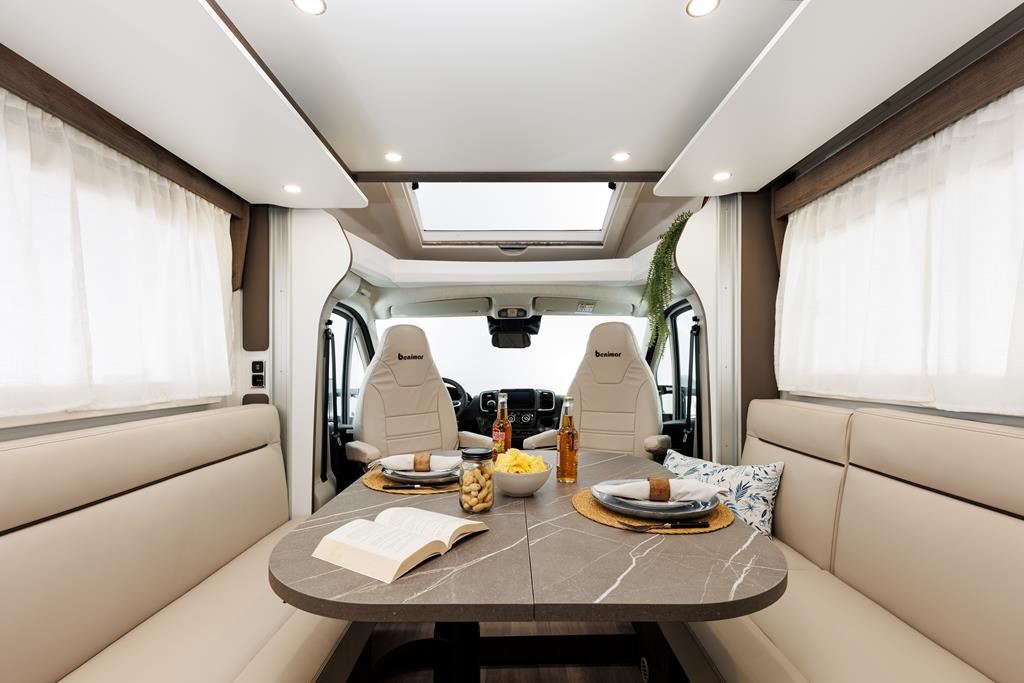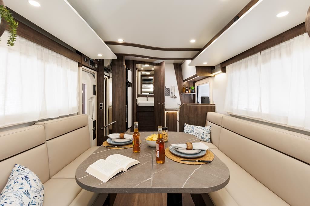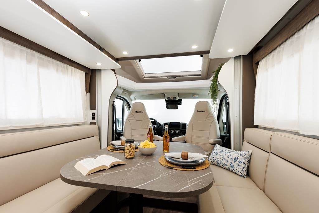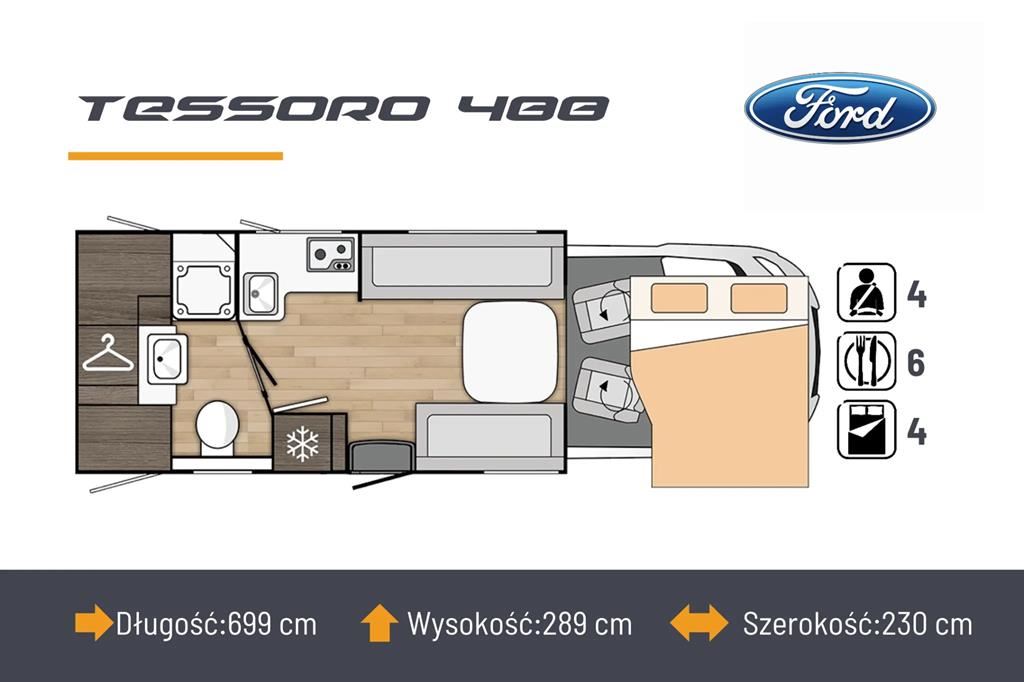 Benimar Tessoro na bazie Forda do 3500kg z silnikiem 170 KM, automatyczną skrzynią i Winter Packiem. Komfortowy salon z zapięciami ISOFIX, rozkładanym stołem i oświetleniem LED. 4 miejsca do jazdy oraz do spania, elektrycznie opuszczane łóżko z dopuszczalną wagą do 230 kg. Kuchnia z dużą lodówką 150L, 3-palnikową kuchenką, opcjonalnym piekarnikiem. Oddzielny prysznic, ogrzewanie Webasto, podgrzewacz Truma. Przestronny bagażnik, panoramiczne okno, pakiety solarne i kamera cofania.