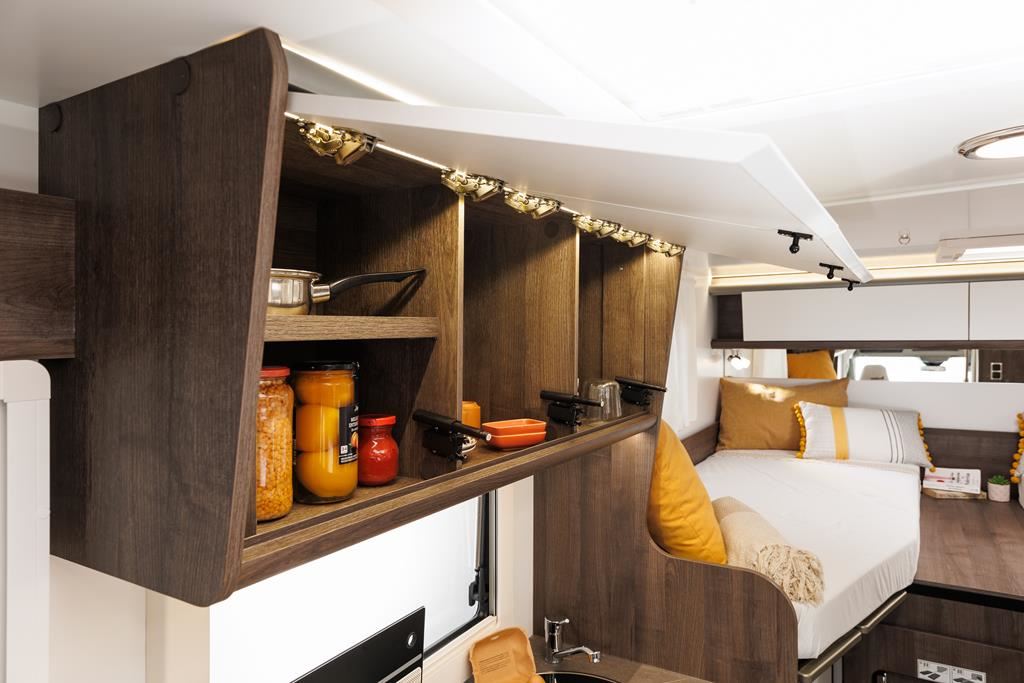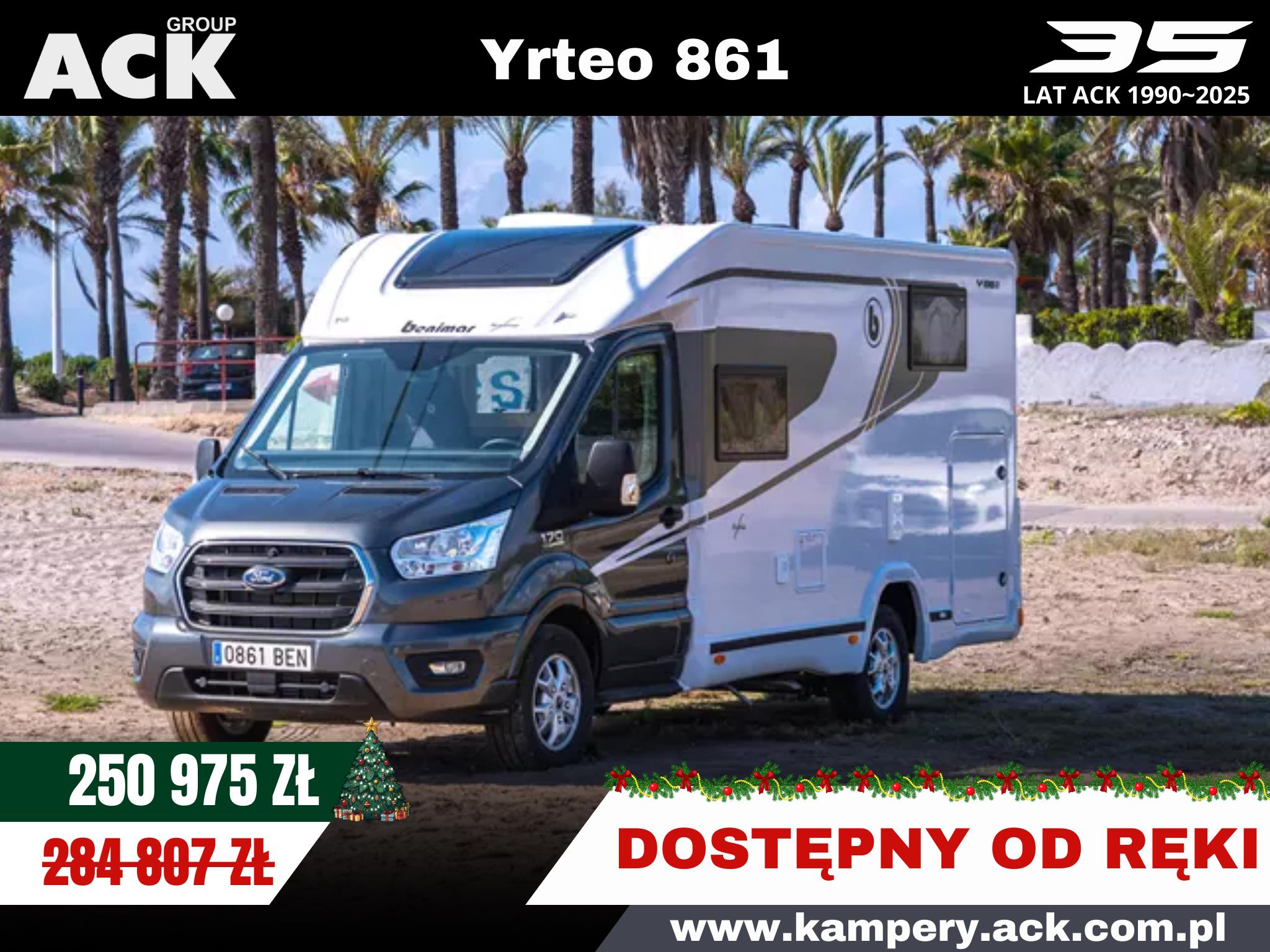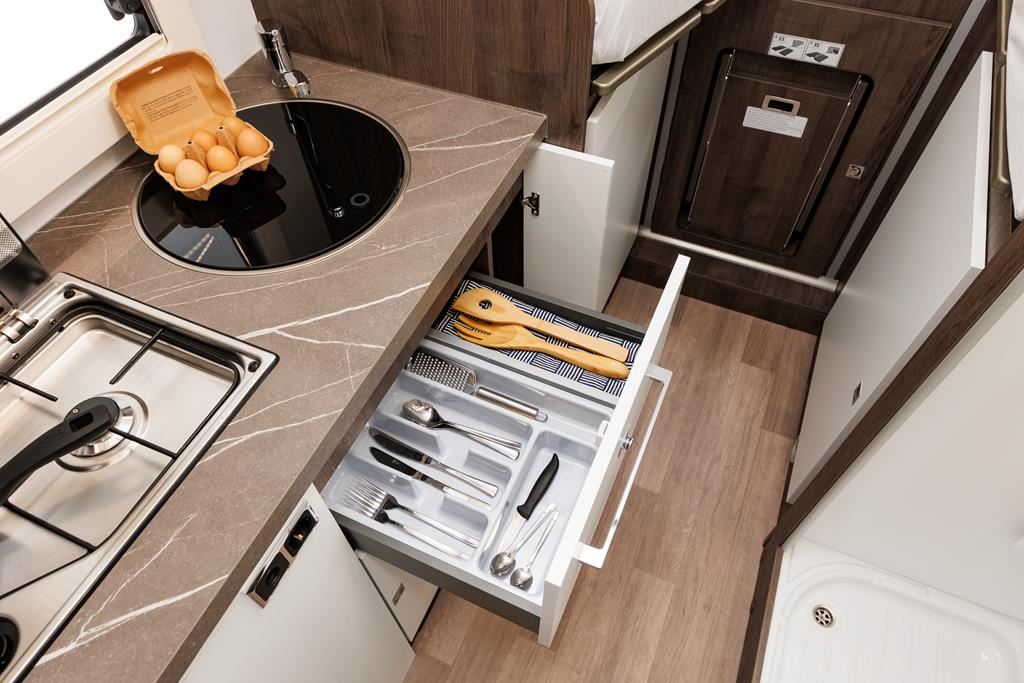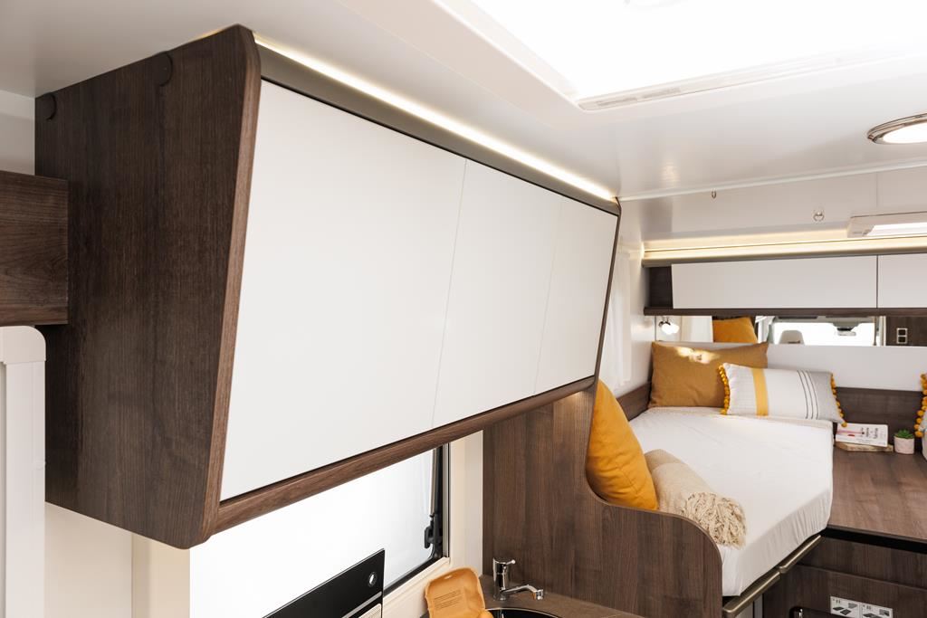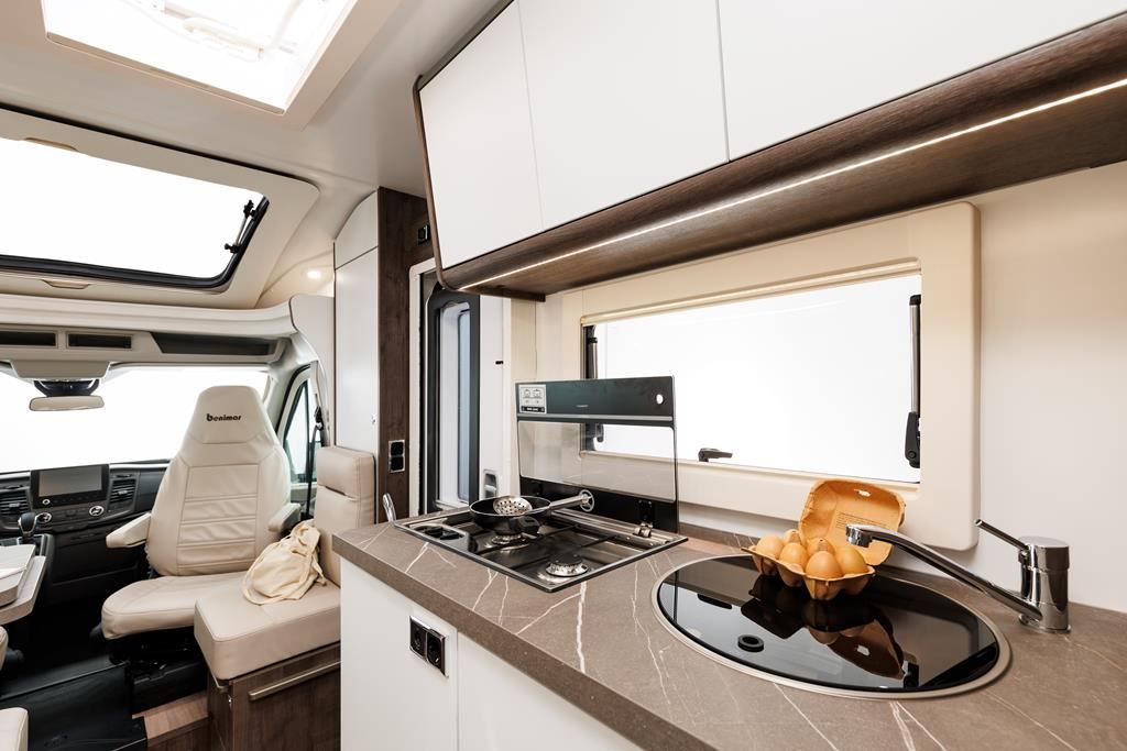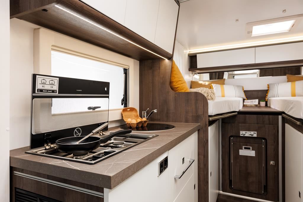 Nowoczesny kamper na podwoziu Ford Euro 6d 170 KM, automatyczną skrzynią biegów i licznymi systemami bezpieczeństwa (ABS, ESP, Hill Start Assist). Wyposażony w klimatyzację, skórzaną kierownicę, radio z ekranem 9", podgrzewane lusterka i szyby. Wnętrze oświetlane ledowo, okna D-Lux z nowoczesnymi meblami, ogrzewaniem Diesel 4000 W, lodówką 70 l, kuchenką gazową, 2 łóżkami i z siedziskami do jazdy z systemem ISOFIX. Dodatki: Pack Proteck, Premium i Winter. Kompaktowe wymiary: 669x214x276 cm, masa 2702 kg.