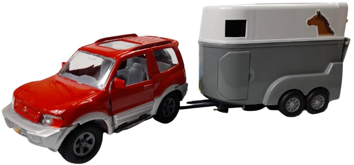 ZABAWKA "AUTO Z PRZYCZEPĄ Z KOŃMI 28 cm CZERWONE