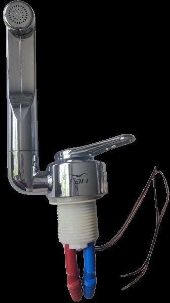 Chromowany, plastikowy kran mieszający z pojedynczym pokrętłem i okrągłą, składaną wylewką