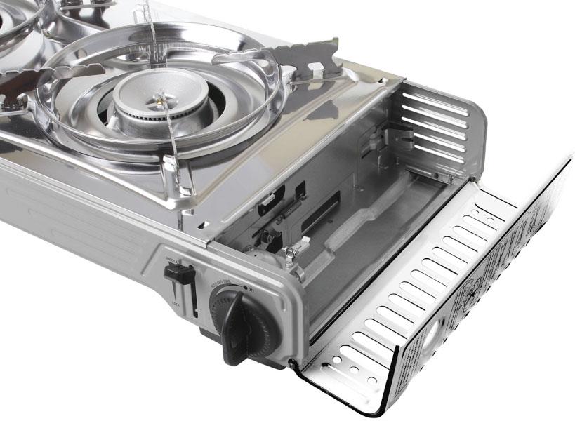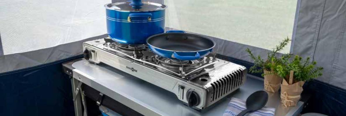 Dwupalnikowa kuchenka z zapłonem piezoelektrycznym, z których każda jest zasilana własnym, łatwo dostępnym kartuszem gazowym zapewniającym wszechstronną wygodę