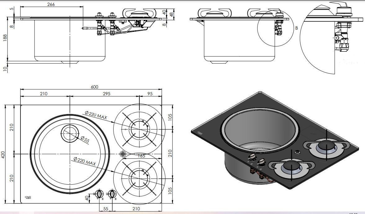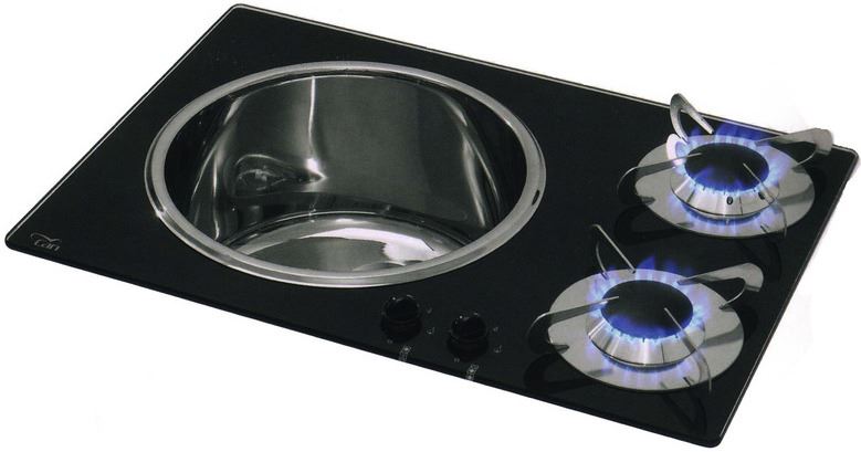 Prostokątna kuchenka z odpornego na zarysowania szkła hartowanego z 2 palnikami SR, w komplecie z okrągłym zlewem ze stali nierdzewnej