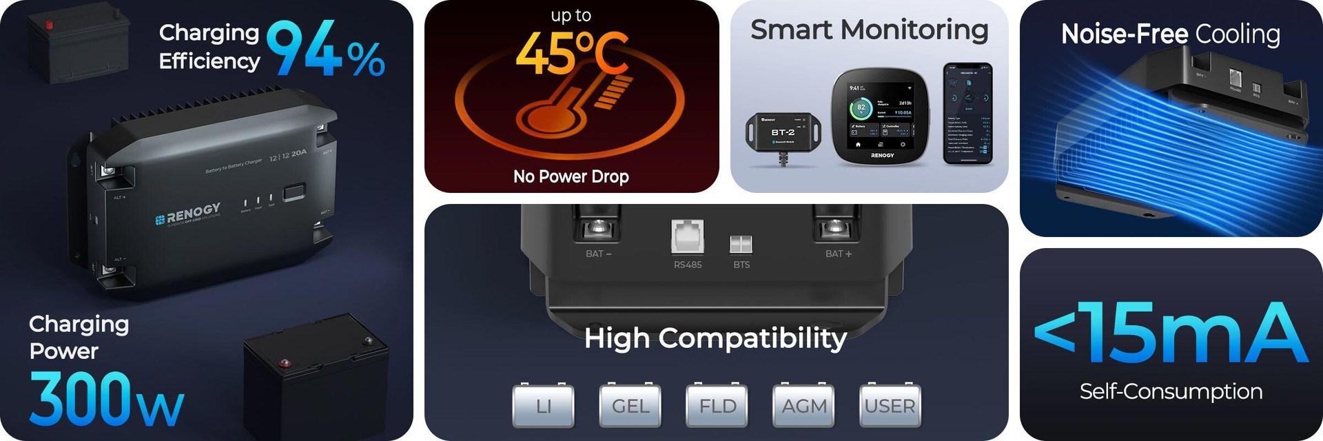 - Ładowarka DCC drugiej generacji inteligentnie dostosowuje moc wyjściową w środowiskach o wysokiej temperaturze, zapewniając wydajne i bezpieczne ładowanie- Moduł Bluetooth BT-2 umożliwia zdalne monitorowanie i kontrolę parametrów ładowania oraz optymalizację stanu baterii bezpośrednio z telefonu przez aplikację DC Home. (Ważne: Moduł Bluetooth nie wchodzi w skład zestawu! Moduł Bluetooth znajdą Państwo w naszej ofercie – jest dostępny osobno w naszym sklepie)- Dzięki inteligentnemu sterowaniu możesz włączać lub wyłączać aktywację baterii litowej w zależności od jej stanu, co zwiększa wydajność i wydłuża żywotność baterii- Wykrywanie pracy alternatora zabezpiecza akumulator rozruchowy- Bezpieczeństwo na najwyższym poziomie potwierdzone licznymi certyfikatami- Prosty i kompaktowy układ zapewniający łatwą instalację