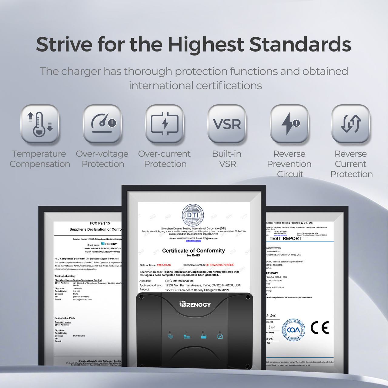 Wiele certyfikatów CE, FCC i PoHs potwierdza jakość i bezpieczeństwo urządzenia. Ta wysokiej jakości ładowarka akumulatorów posiada wiele inteligentnych zabezpieczeń takich jak: ochronę przed odwrotną polaryzacją, izolację akumulatora, ochronę przed przepięciem, ochronę przed temperaturą itd.