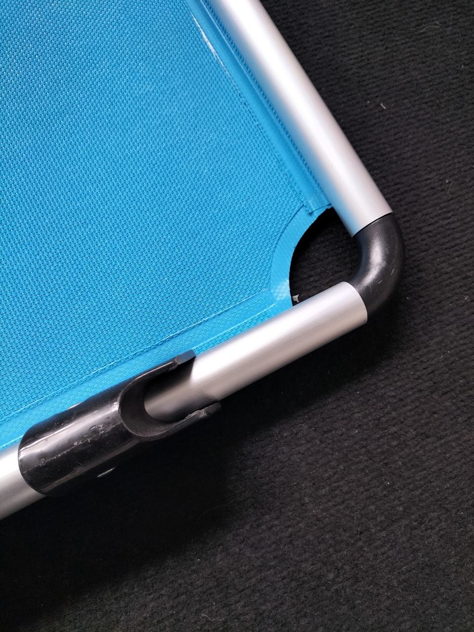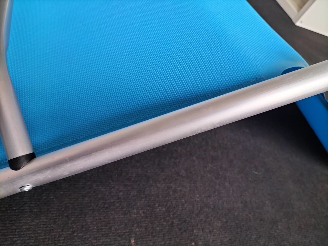 Ważne: Zdjęcia poglądowe, leżak powystawowy, posiada plamy na materiale oraz rysy na ramie, w daszku przeciwsłonecznym brakuje elementów umożliwiających jego montaż, wszelkie defekty widoczne są na zdjęciach!