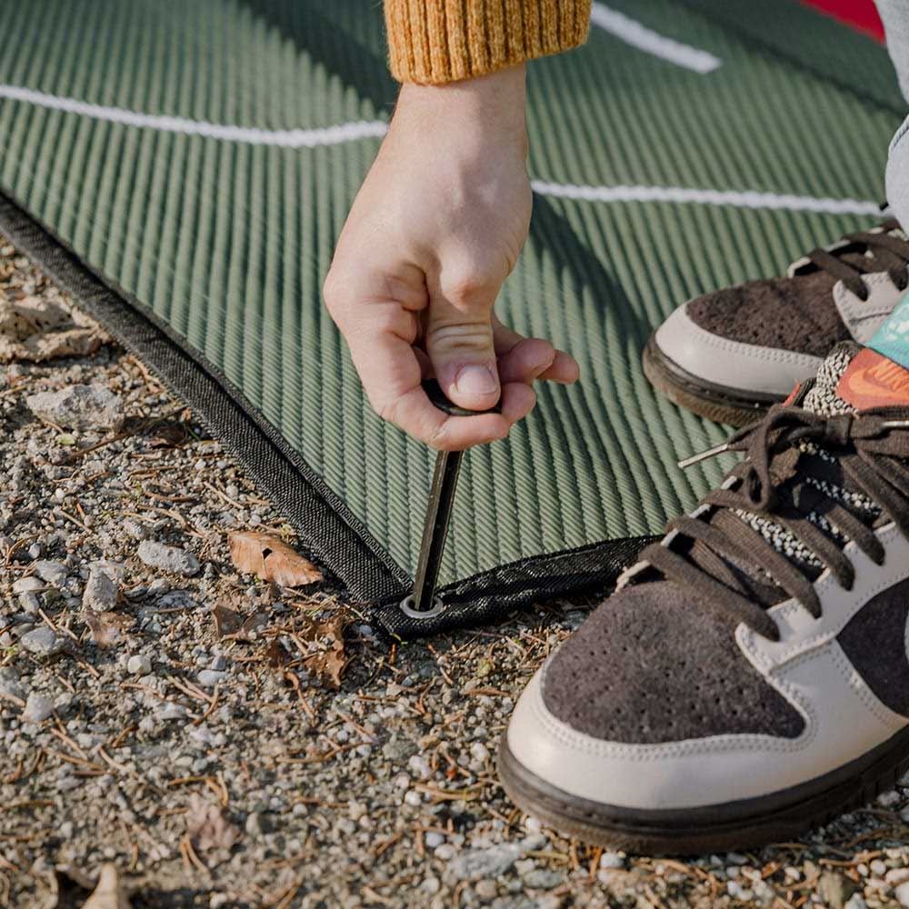 Starannie obszyta, na rogach wzmocnione oczka do przymocowania maty do podłoża za pomocą śledzi