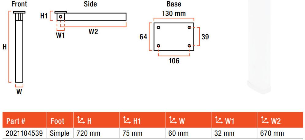NOGA STOŁU SREBRNA 720x60x32 mm