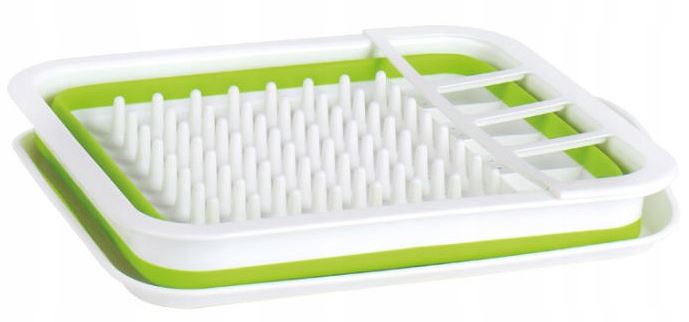 W zestawie dwie części: składany ociekacz i podkładka na ociekającą wodę która spełnia także funkcję tacy