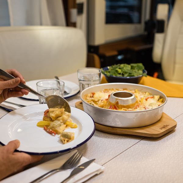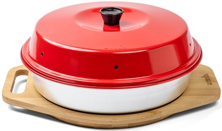 Postaw piekarnik Omnia na środku stołu na eleganckiej, bambusowej podkładce