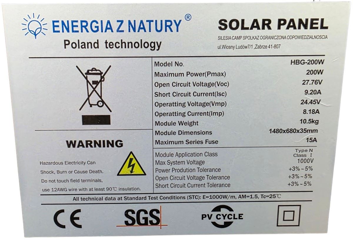 Panel słoneczny HBG-200W to produkt o wysokiej niezawodności, zaprojektowany do długotrwałego użytku na zewnątrz