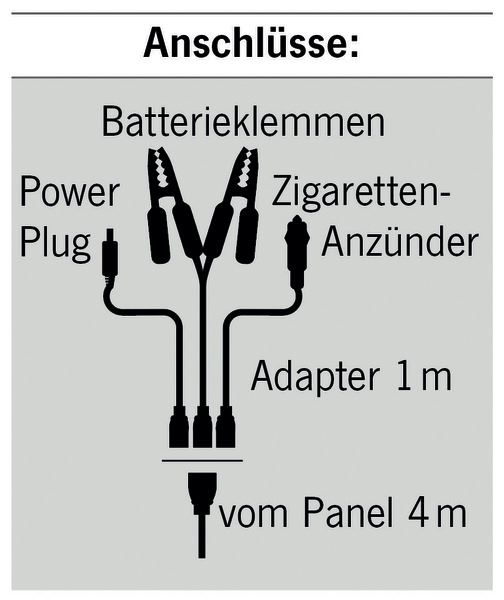 W zestawie 3 adaptery z kablem przyłączeniowym o długości 1 m każdy: zaciski krokodylkowe, kabel do zapalniczki samochodowej, wtyczka zasilająca