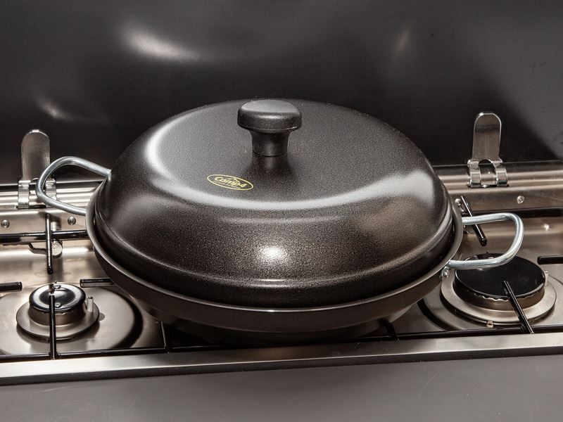 Płaska płyta do grillowania Ø 32 cm z rusztem, garnkiem i pokrywką nadaje się m.in. do pieczenia, frytek, ciast, pizzy, tart, popcornu i wielu innych potraw