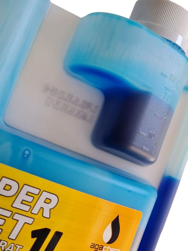 Precyzyjna miarka ułatwia dozowanie środka bez rozlewania