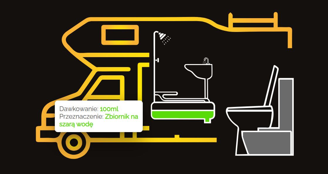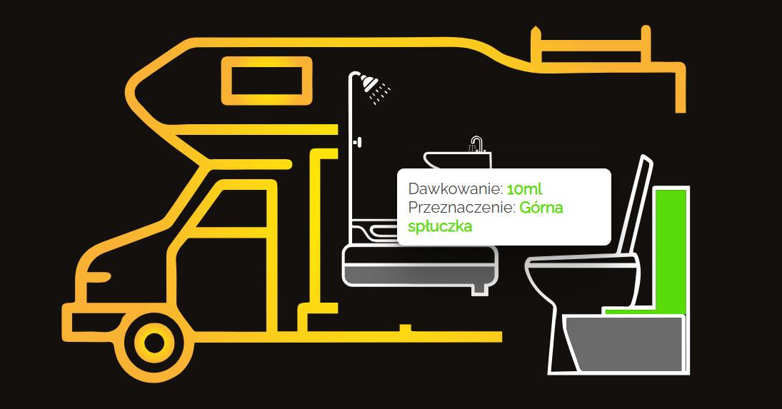 - 20 ml na każde 10 L pojemności zbiornika na nieczystości, a następnie uzupełnić woda w ilości 1 - 2 L