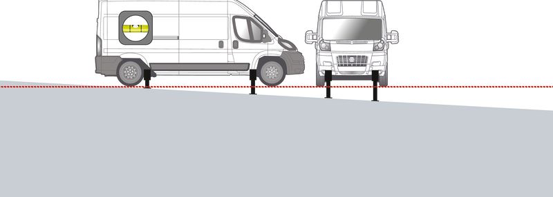 Po pierwszym naciśnięciu przycisku na jednostce sterującej system sam zajmie się resztą, szybko i automatycznie obniżając cztery podnośniki, aby ustawić kampera w pozycji poziomej
