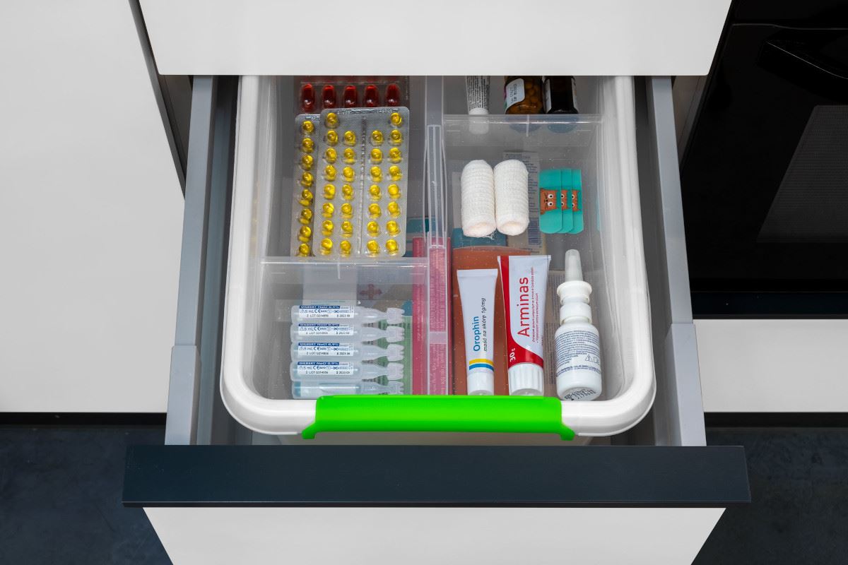 Białe pudełko z przezroczystym insertem i pokrywką ułatwia segregowanie, zabezpieczenia i dostęp do lekarstw