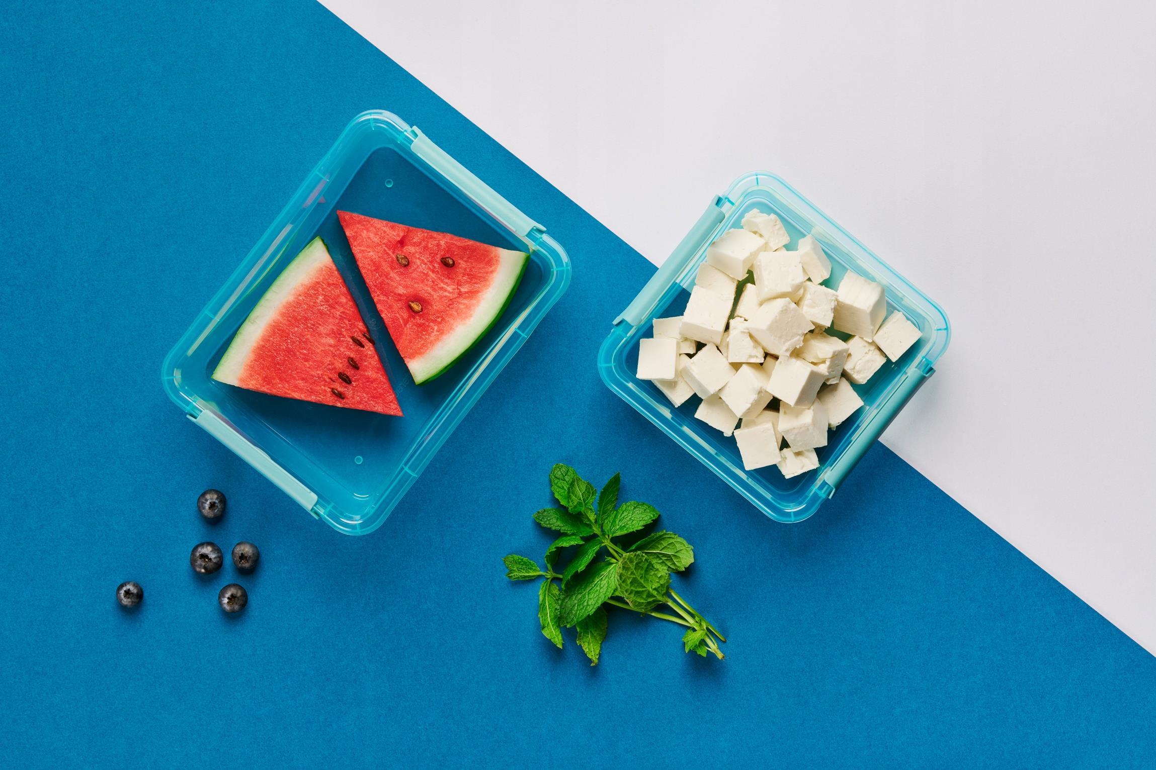 Wyraźny, niebieski kolor oraz biała pokrywka wyróżniają się a przezroczyste ścianki pozwalają na szybkie sprawdzenie co znajduje się w pojemniku