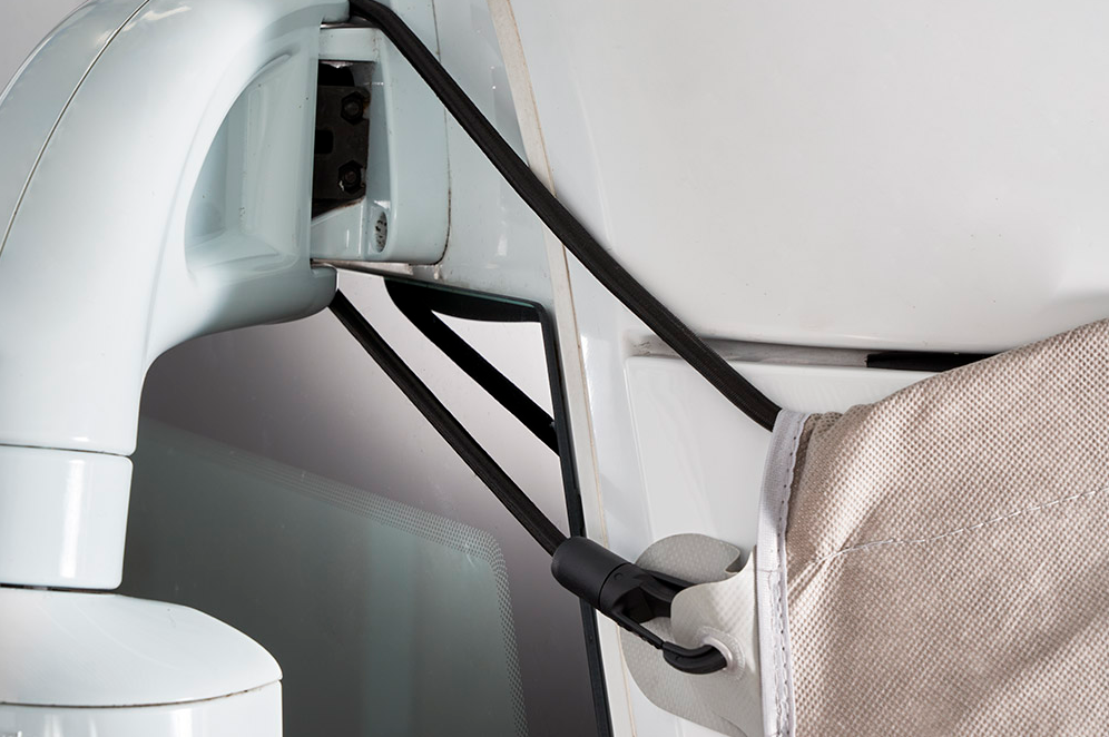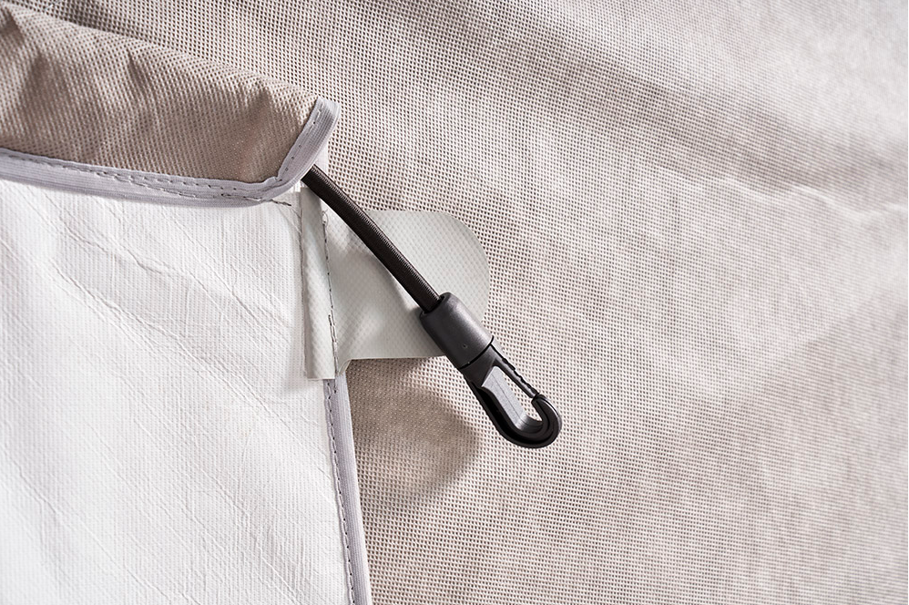 Gumowy napinacz jest wbudowany wzdłuż górnej krawędzi maty ochrony termicznej, aby przymocować, połóż go na lusterku wstecznym i zaczep w oczkach bocznych linek mocujących