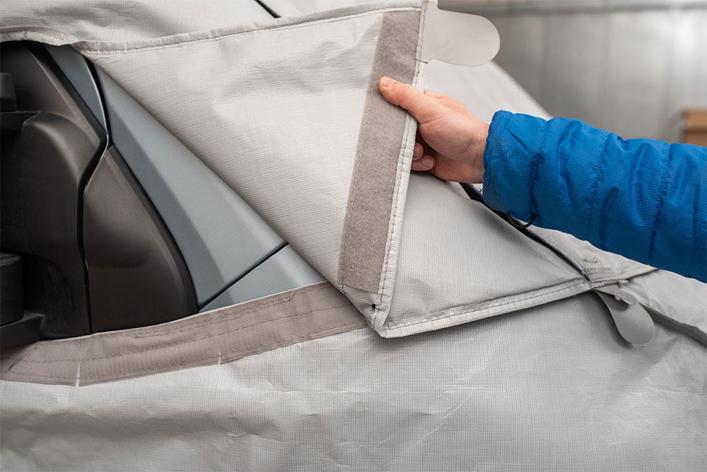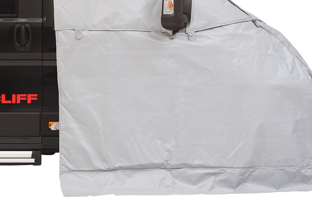 Na dolnej krawędzi znajduje się osłona przeciwwiatrowa ze zintegrowanymi oczkami, która skutecznie chroni całą kabinę przed wnikaniem zimna przez nieizolowaną komorę silnika, nadkola i drzwi kabiny