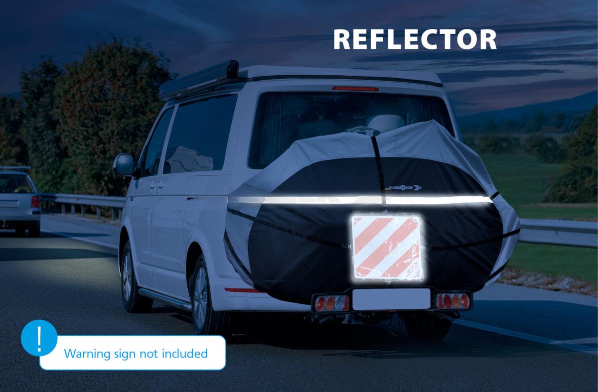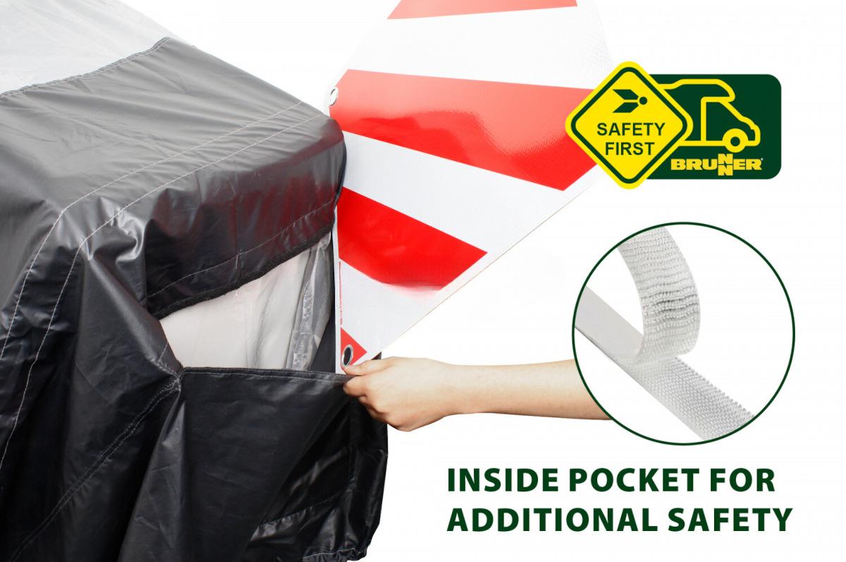 Kieszeń na tablicę ostrzegawczą jest zapinana na rzep od wewnątrz dla dodatkowego zabezpieczenia od kradzieży tablicy