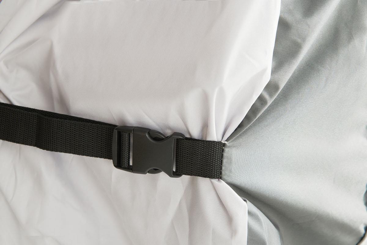 Przed rozpoczęciem jazdy upewnij się, że pokrowiec został starannie zabezpieczony pasami i nie jest luźny!