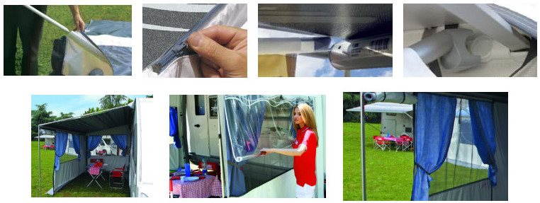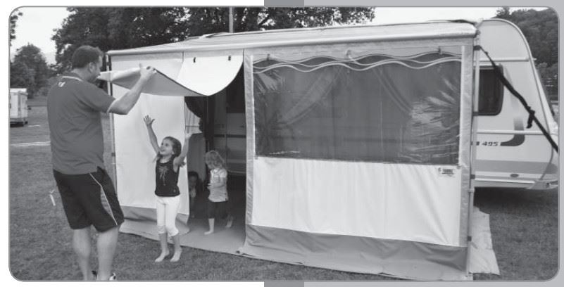 Każdy panel boczny posiada pionowy zamek błyskawiczny na przedniej krawędzi panelu, który łączy się z przednim panelem zamka Fiamma Caravanstore