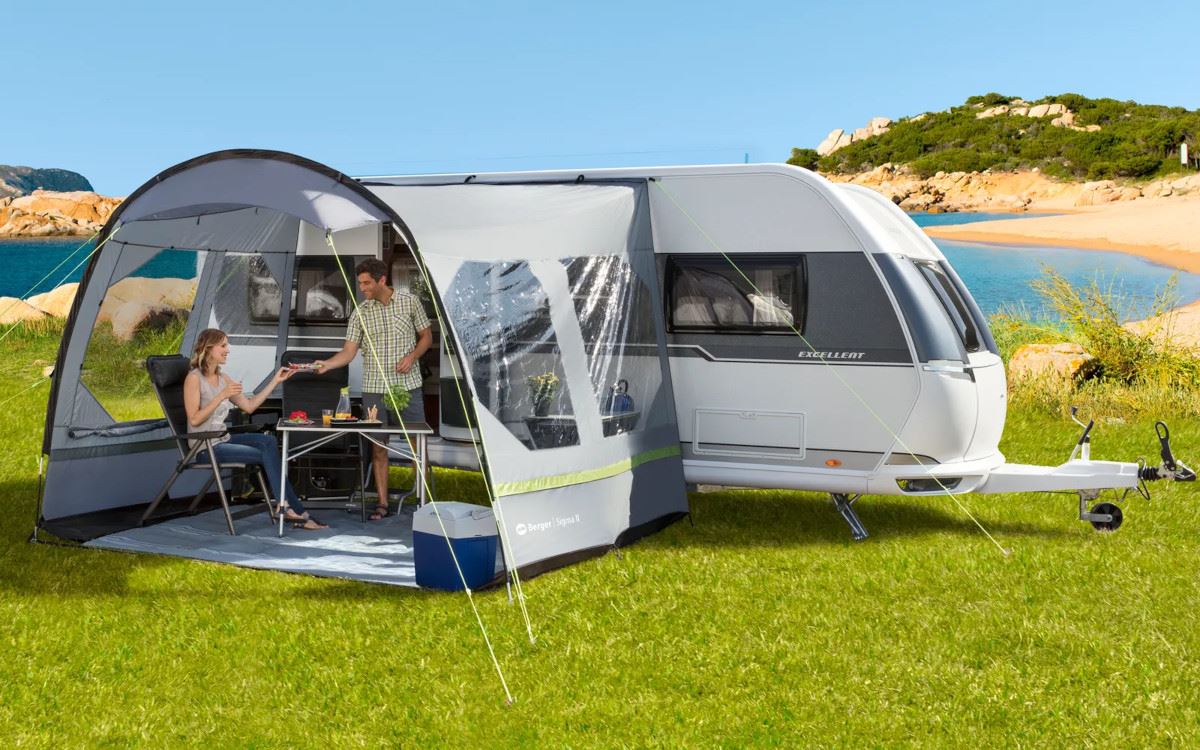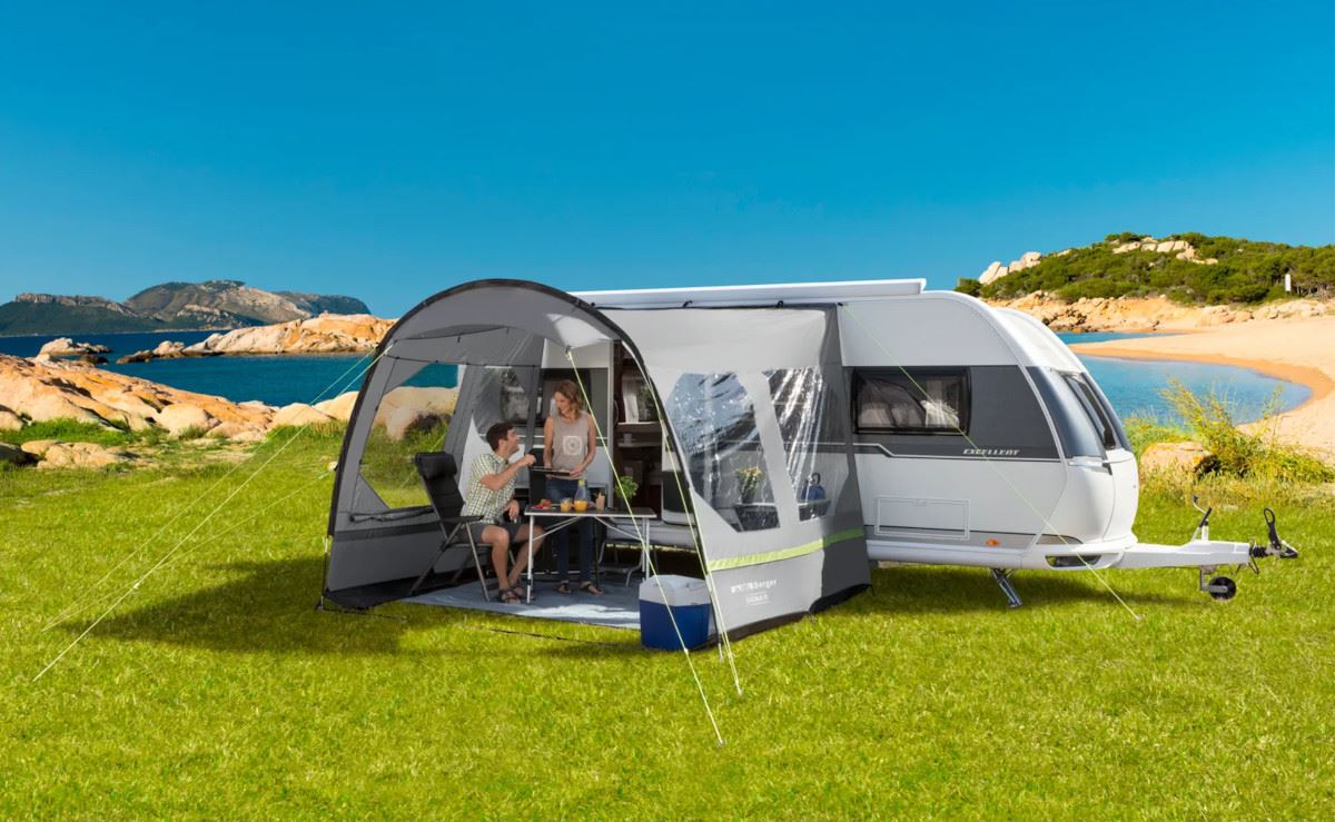 Przestronny baldachim przeciwsłoneczny Berger Sigma II z dużymi oknami (zamykanymi od wewnątrz) zapewnia ochronę przed słońcem i lekkim deszczem