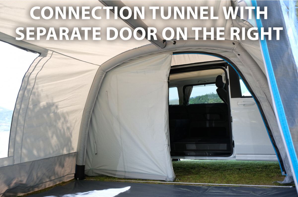 Przestronna konstrukcja z tunelowym połączeniem z pojazdem pozwala swobodnie poruszać się po namiocie