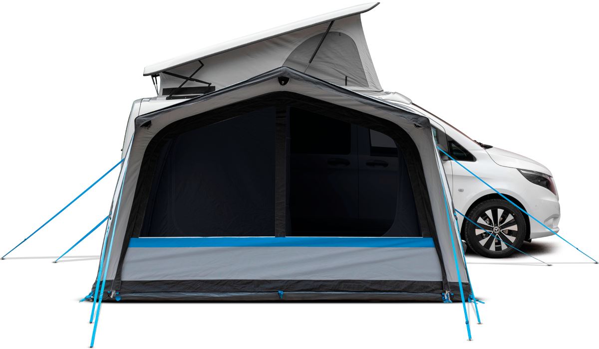 Przestronna konstrukcja z tunelowym połączeniem z pojazdem pozwala swobodnie poruszać się po namiocie