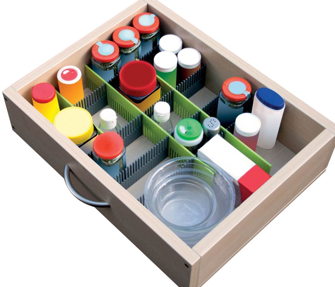 Chroni wszystkie przedmioty: pojemniki na żywność, materiały biurowe, małe narzędzia, materiały hobbistyczne, przyprawy kuchenne