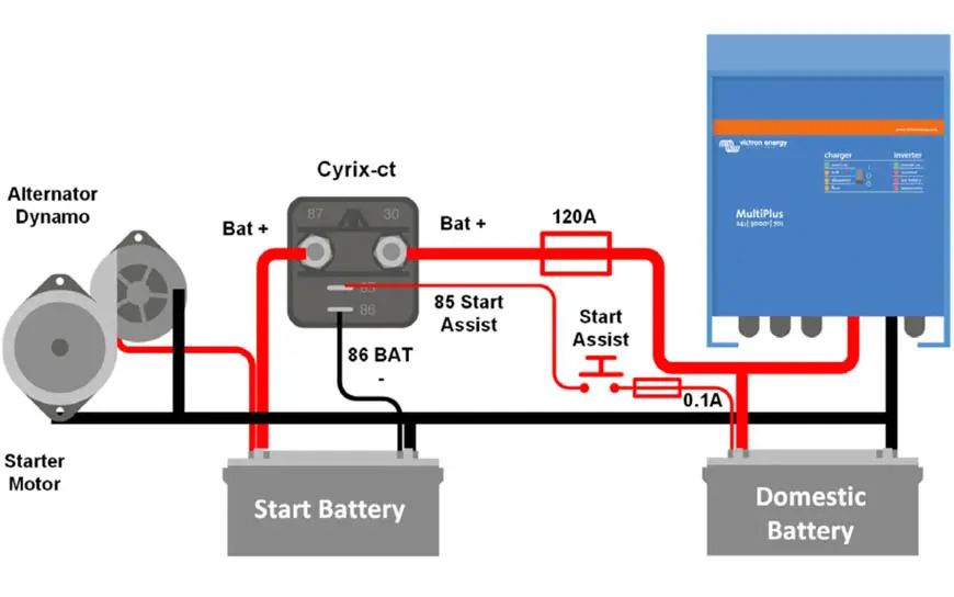 Uwaga: Cyrixa nie należy stosować do ładowania akumulatora dodatkowego lub agm a tym bardziej LiFePO4 z alternatora. W pierwszych 2 przypadkach zbyt duży prąd wysyłany przez alternator będzie wpływał na zmniejszenie trwałości akumulatorów dodatkowych 1-2 sezony. W drugim przypadku prąd pobierany przez LiFePO4 może uszkodzić alternator bo będzie wymuszał pracę alternatora na 100%