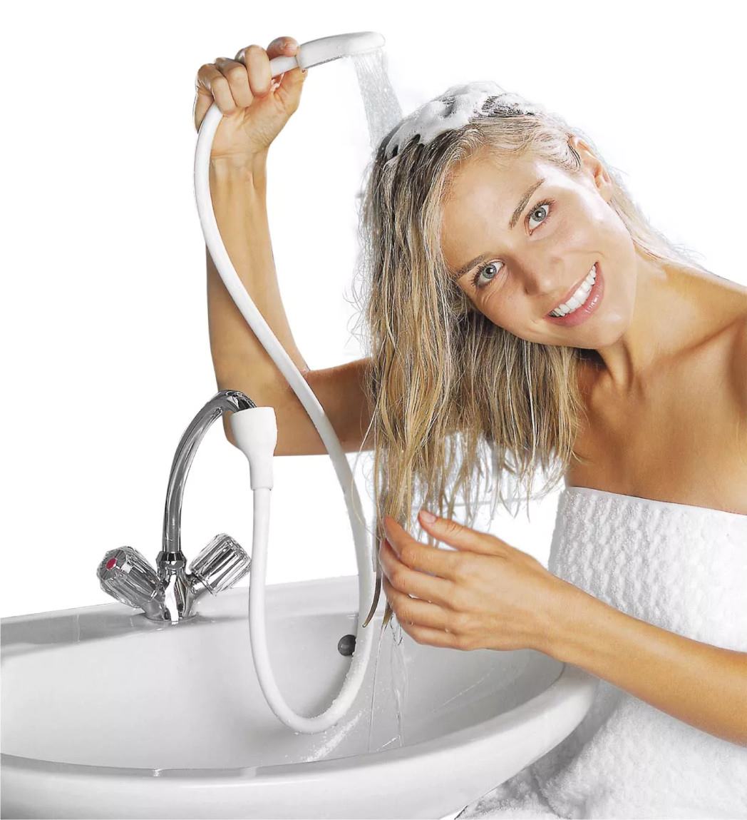 Miniaturowy prysznic pasuje do każdej standardowej umywalki i sprawia, że ??mycie włosów staje się proste w zaledwie kilka minut