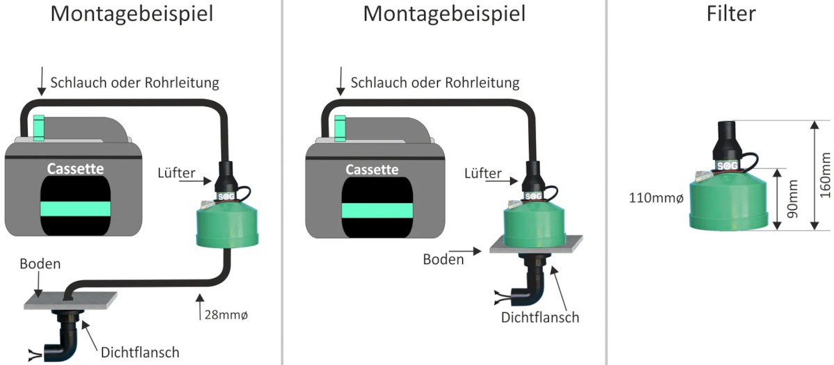Zaletą filtra SOG ® II jest to, że można go elastycznie umieścić w różnych miejscach kampera i w każdym miejscu (np. w garażu, pod siedzeniem, w podłodze lub schowku) odpowietrzać przez podłogę