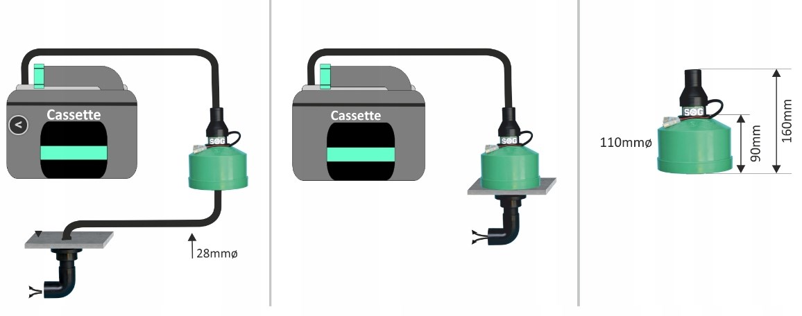 Wąż lub rurę przedłużającą można podłączyć zarówno przed kompaktowym systemem, jak i do odpływu podłogowego, aby znaleźć odpowiednie miejsce