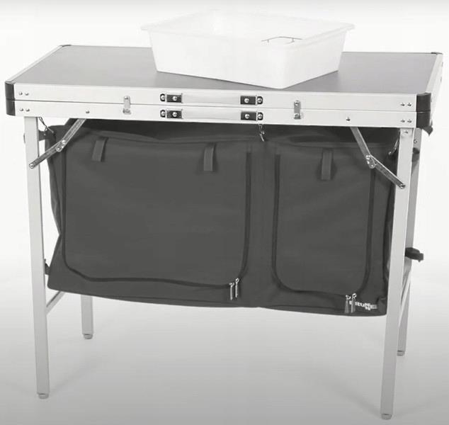 W zestawie plastikowy zlew, metalowe półki oraz torba transportowa