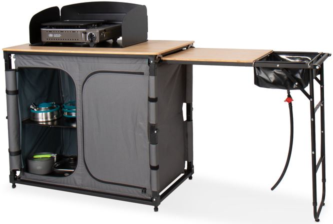 Posiada zlew z odpływem i rozkładany uchwyt na worek na śmieci