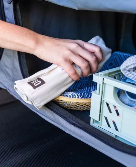 Torbę na sztućce łatwo zwinąć i zajmuje niewiele miejsca w pojeździe kempingowym