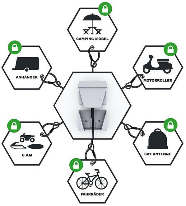 Skutecznie zabezpiecza przed kradzieżą przedmioty mobilne takiego jak rowery, meble kempingowe, deski surfingowe, anteny satelitarne oraz wszystkie inne przedmioty znajdujące na zewnątrz kampera lub przyczepy
