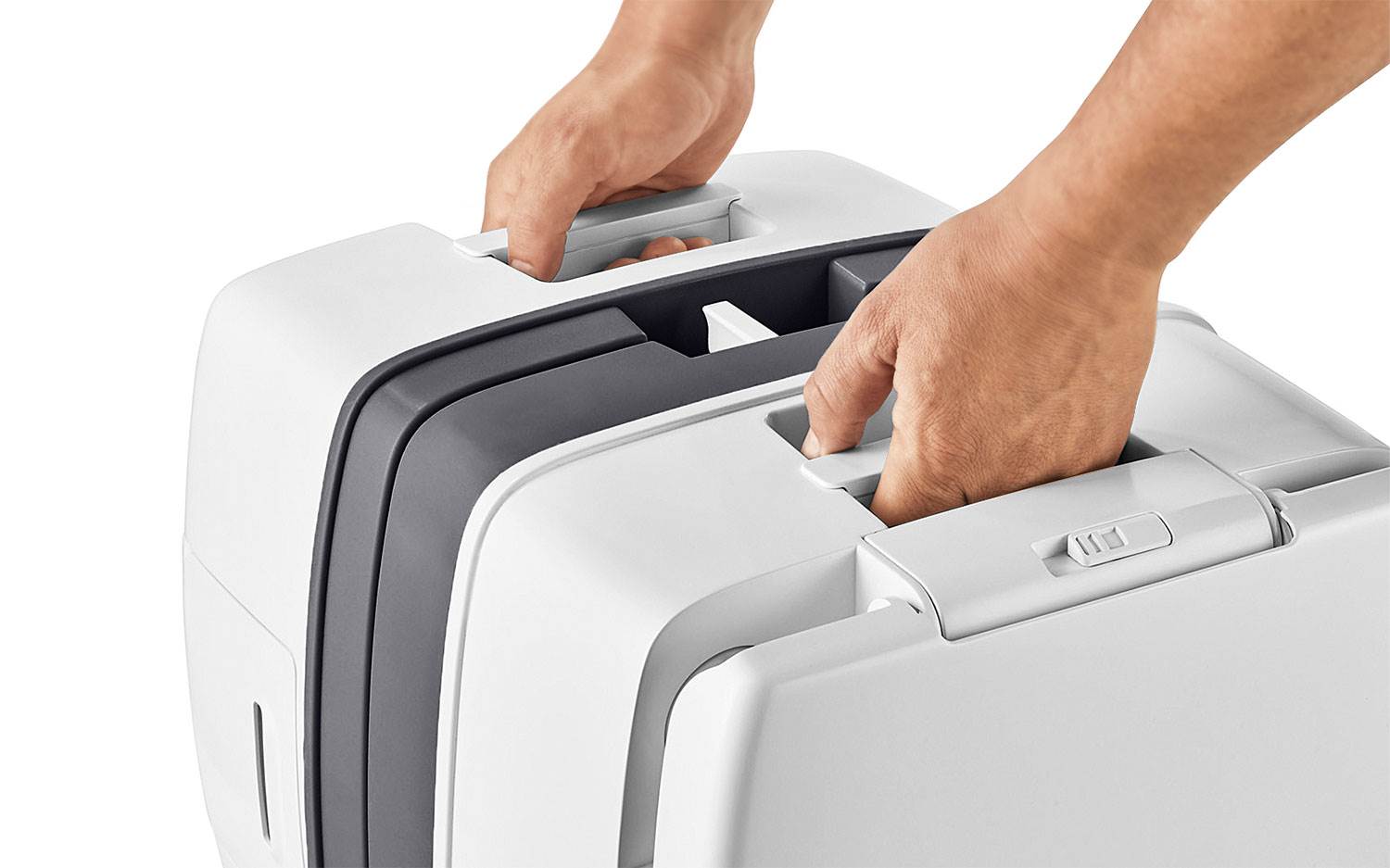 Zbiornik zintegrowany z rączką i kółkami ułatwiającymi transport